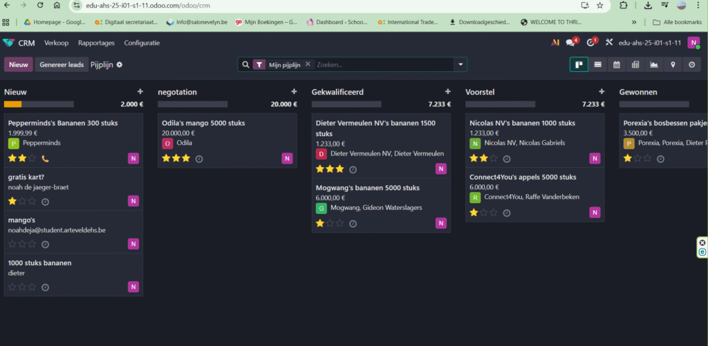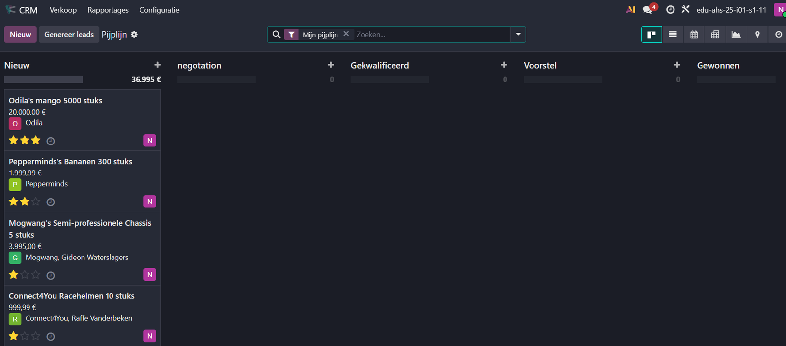 De standaard Kanban-weergave van de sales leads is aangepast en uitgebreid. Er is een extra, zinvolle fase, “Negotiation”, ingevoegd na de fase waarin de offerte is verzonden. Dit zorgt voor een gedetailleerdere en nauwkeurigere weergave van de sales funnel.