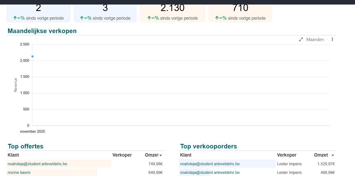 Na succesvolle aankopen door verschillende klanten via de webwinkel, zijn de verkoopstatistieken in Odoo geanalyseerd. Hierbij is onderzocht waar de gemiddelde verkoopwaarde en de topkopers (ranking van klanten) terug te vinden zijn. Daarnaast is een speciale offerte (quotation) aangemaakt voor een bedrijfsklant die een kwantumkorting ontvangt op een grote bestelling, wat het omgaan met klantspecifieke prijzen bewijst.