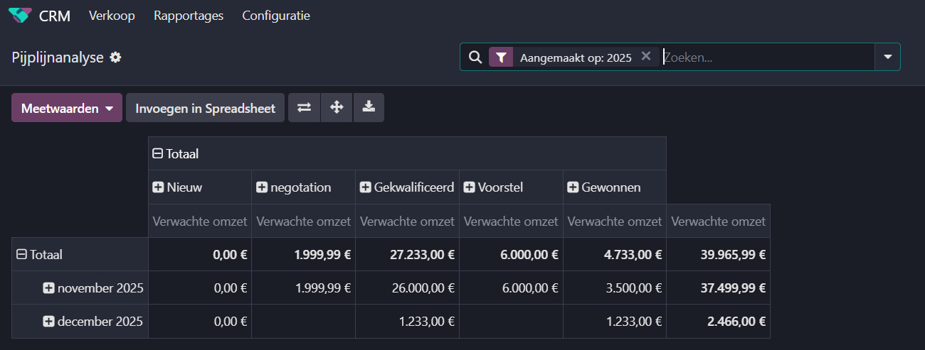 Voldoende manuele sales leads zijn aangemaakt om de pijplijn te vullen. Alle cruciale velden (zoals Expected Revenue, Customer, en Salesperson) zijn ingevuld. Deze leads zijn strategisch over de komende maanden gepland en toegewezen aan verschillende sales medewerkers, wat noodzakelijk is voor zinvolle prognoses.
