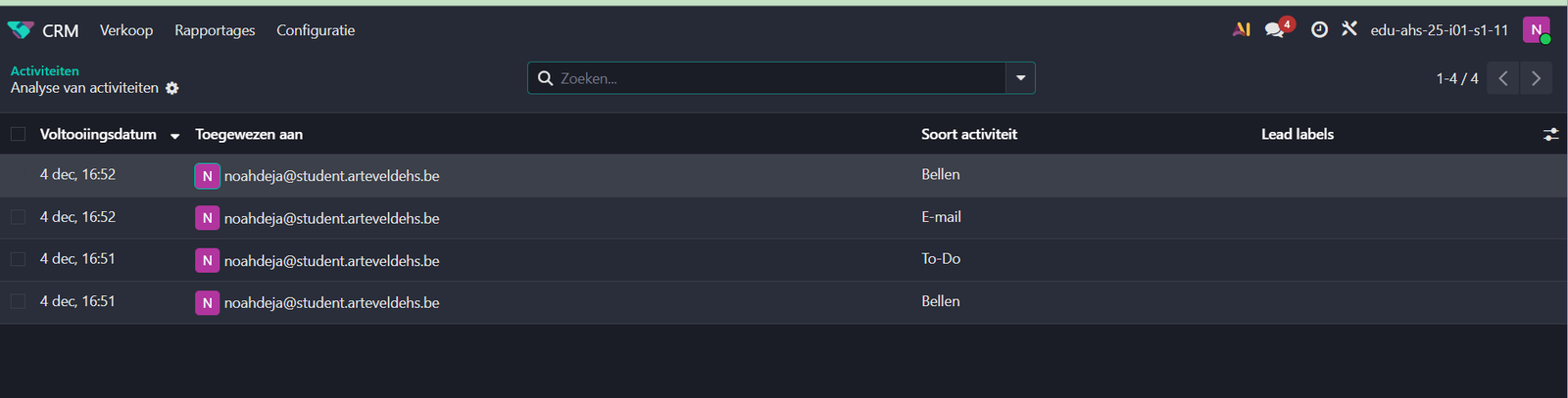 Vier verschillende actietypes (bijvoorbeeld ‘Telefoon’, ‘E-mail’, ‘Vergadering’) zijn aangemaakt en gekoppeld aan leads in verschillende fasen. De leads zijn denkbeeldig door de funnel getrokken, waarbij de kernvelden (zoals Stage en Probability) geëvolueerd zijn. De dagelijkse takenlijst van een salesmedewerker is getoond om het beheer van deze acties te bewijzen.
